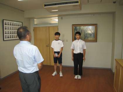 9月10日(火)激励会 公開日 2024/09/10 更新日 2024/09/10 学校行事 大阪で開催される「全国ヤングクラブバレーボール大会」に出場する生徒の激励会を校長室で行いました。大会では、悔いのないよう精一杯プレイしてきてください。