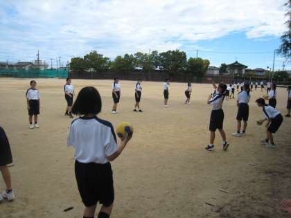 ハンドボールが始まりました。2人1組で対面パスをしています。