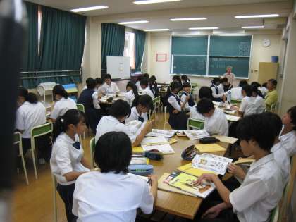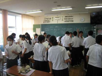 「Do you like ○○?」と質問しながら、答えが「Yes」なら1枠に色を塗ります。縦・横・斜めのいずれかを早く塗りつぶした人がビンゴです。「Do you like soccer?」や「Do you like studying?」など、どの質問だとどの人が「Yes」になりそうか考えながら質問をしています。