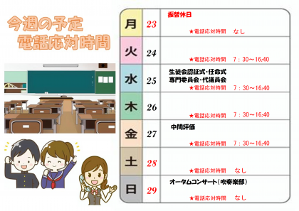 9月23日(月)〜9月29日(日)までの予定 公開日 2024/09/24 更新日 2024/09/24 そ の 他 9月23日(月)〜9月29日(日)までの予定です。 今週は部活動を実施しない週となりますので、電話応対は16時40分で終了いたします。