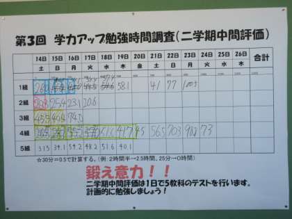 今週末の中間評価に向けて、学年全体で学力アップ活動を実施しています。