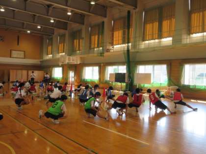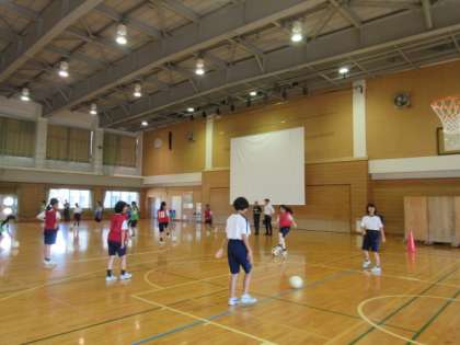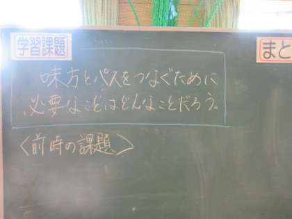 整列・点呼と準備運動を終え、本時の課題と流れを確認した生徒たちは、基本のパス練習を始めました。
