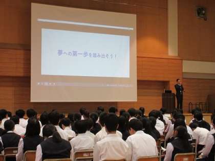 講師の先生方が、スライドや動画を用いて各高校の特徴や高校卒業後の進路について説明され、生徒たちも真剣に講師の先生方のお話を聞いていました。