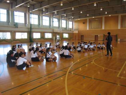 ハンドボールの授業が終わり、次はバスケットボールの授業が始まりました。教員からシュートの仕方のコツなどを聞いています。