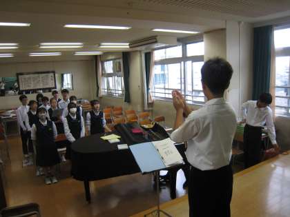 指揮者や伴奏者に合わせて合唱しています。新庄中学校では全校合唱、学年合唱、クラス合唱と3曲歌うので、どの曲も頑張って歌います。