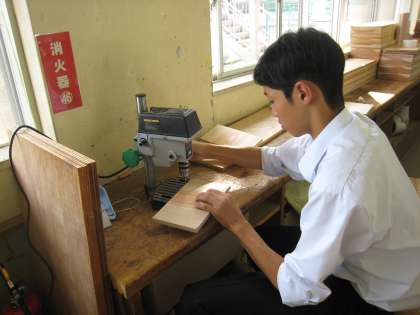 写真上:木材にドリルで穴を開けています。