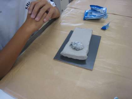 エプロンや体操服に着替えて準備万端!!今から実際に粘土を使って手を造っていきます。