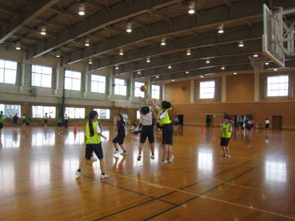 オフェンスが5人、ディフェンスが3人のゲーム形式でバスケットボールを楽しんでいます。