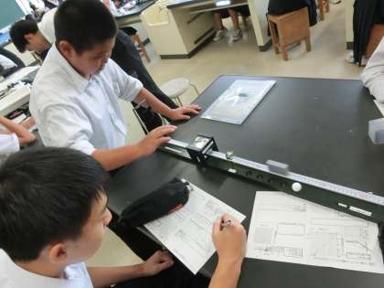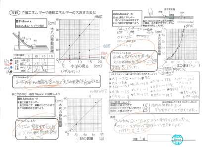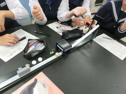 理科(3年3組) 公開日 2024/10/24 更新日 2024/10/24 3学年 位置エネルギーや運動エネルギーと力学的仕事との関係を調べてグラフに表す実験活動を行いました。 斜面を下る球での実験も、速度計を用いて手球の速度を変化させての実験も、どの班も積極的にデータをとり、グラフに仕上げていました。