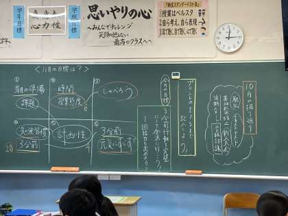 毎月、各クラスで学級目標に対する自分たちの行動と来月は何を意識して生活するのかを振り返っています。自分たちの行動を振り返り、できた事できなかった事をハッキリさせて来月の成長につなげています。