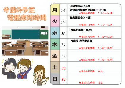 11月18日(月)〜11月24日(日)の予定 公開日 2024/11/18 更新日 2024/11/18 そ の 他 11月18日(月)〜11月24日(日)の予定です。 今週から期末評価前の部活動停止期間となります。 電話応対時間は、原則16時40分までとなりますが、3年生の進路懇談会があるため、18日(月)〜20日(水)までは、17時30分までつながります。