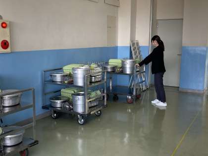 給食前には毎日、教員が給食のワゴンを廊下に並べています。今日は並べている最中に通りかかった2人の女の子が「いつもありがとうございます」と言ってくれました。