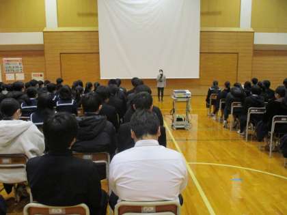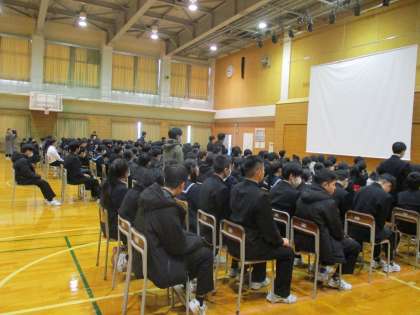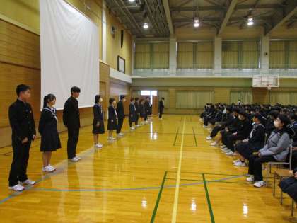 1限に、体育館で学年集会を行いました。様々な部門から2学期頑張った人を表彰するMVPを学年生徒会から発表をしたり、各クラスの2学期の振り返りを行いました。先生方のお話もあり、3学期は「結べ真心」ができるようになろうというお話もあり、学年で一致団結をして大きな受検という道を切り開いてほしいと思います。
