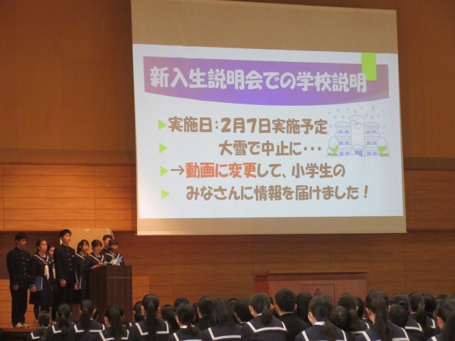 受賞報告の後、生徒会からの報告がありました。この報告をもって後期生徒会の活動は終了です。よりよい新庄中学校を目指して様々な取組を行ってくれた生徒会の皆さん、本当にありがとうございました。