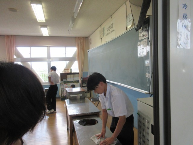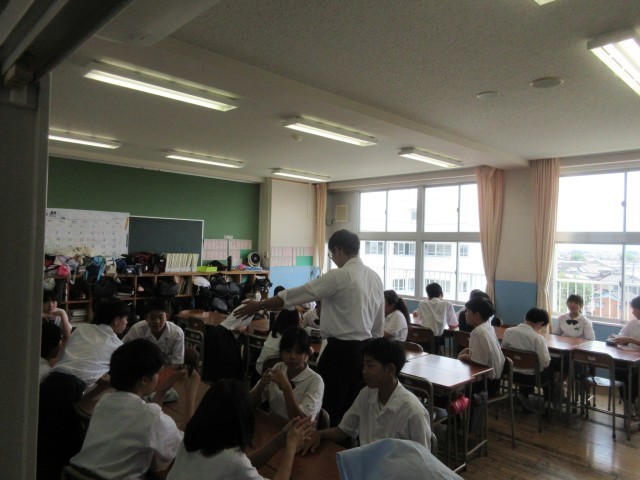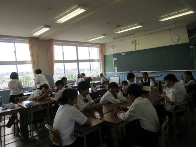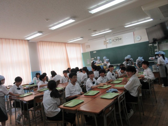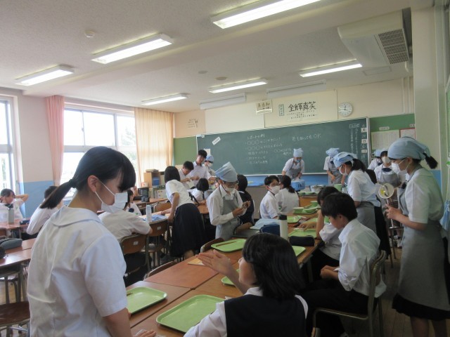 ふと思い立って1年生の給食準備の様子を見に行くと、きちんと廊下に整列する当番、教室で着席して待つ生徒、配膳台を拭く係生徒など、それぞれの役割を果たそうと頑張っている姿が見られました。また、廊下にいた生徒に話しかけると笑顔で答えてくれたり、教室をのぞいたときに「こんにちは!」と爽やかに挨拶をしてくれたりと、心があたたかくなりました。「いただきます」の5分前には学年廊下に生徒が誰もいない状態になっていて、ルールを守ってよりよい学校生活を送ろうと努力していることが伝わってきました。