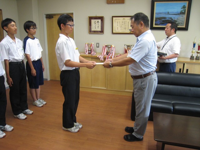 昼休みに、”第42回全日本少年軟式野球大会北信越大会”ならびに”第37回北信越クラブユースサッカー(U-15)選手権大会”に出場する生徒に激励を行いました。