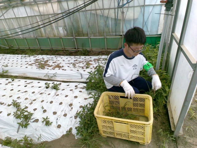 ビニルハウス内の除草をしています。ビニルハウスを夏場閉め切ると、室内の温度が70度にもなるそうです。職員の方から熱中症に配慮いただきながら作業を進めています。