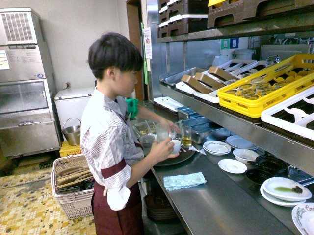 食器をバックヤードに下げ、種類ごとに仕分けをしている様子です。