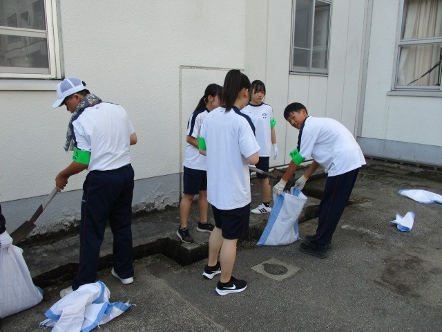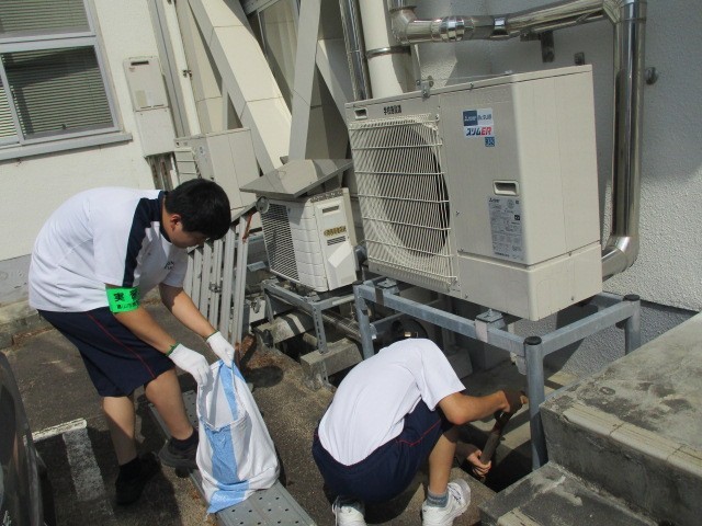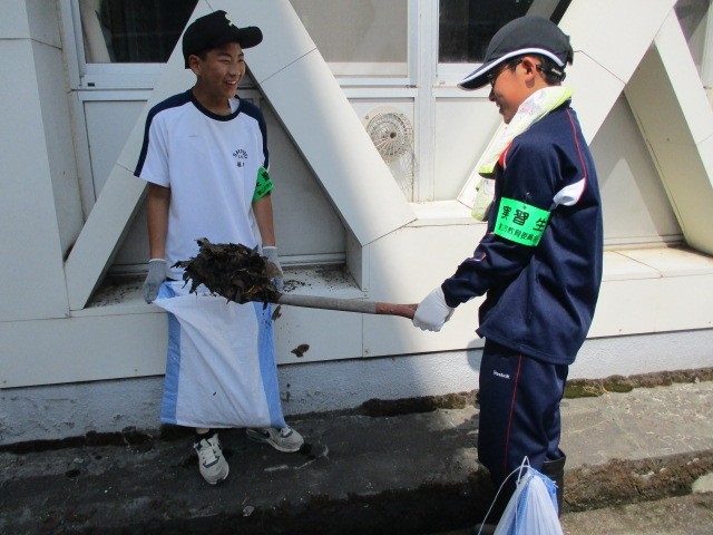 駐車場の溝掃除、校舎の窓拭き、トイレ掃除をしました。