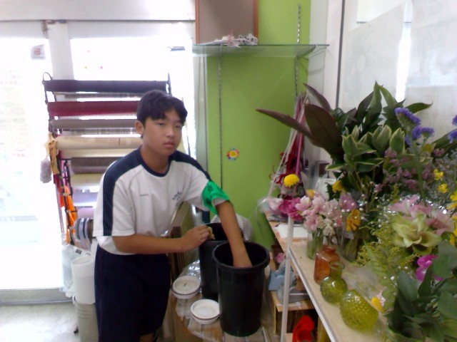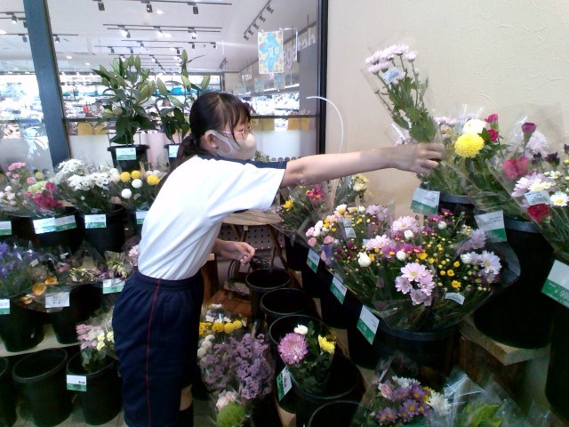 花を陳列棚に丁寧に並べています。