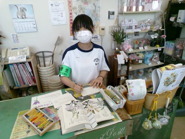 商品の花を紹介するためのポップを作っています。後日、実際に店頭に貼っていただける予定です。