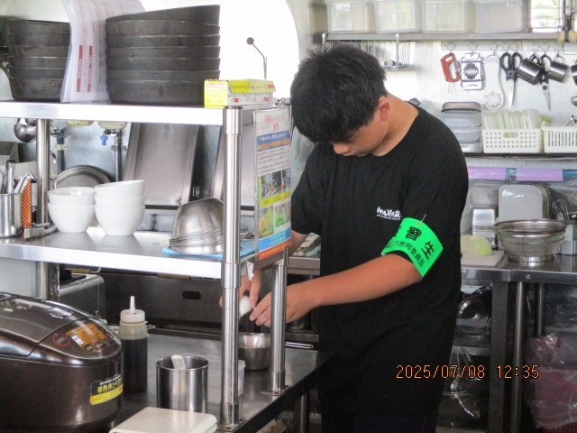 3枚目はラーメン花月での活動の様子です。お客様の注文を受けて、準備をしています。