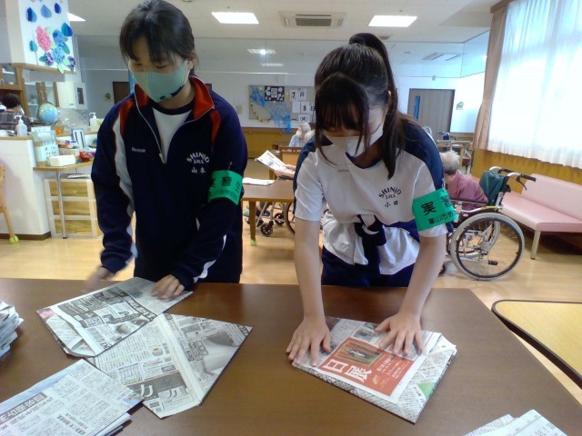 リハビリ作業の指導ができるように、新聞紙を折ってゴミ箱を作っていました。