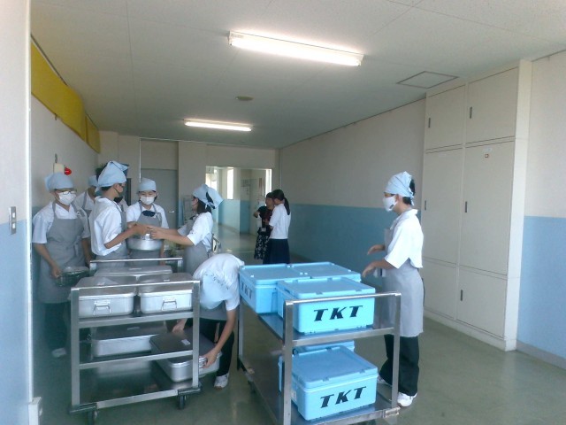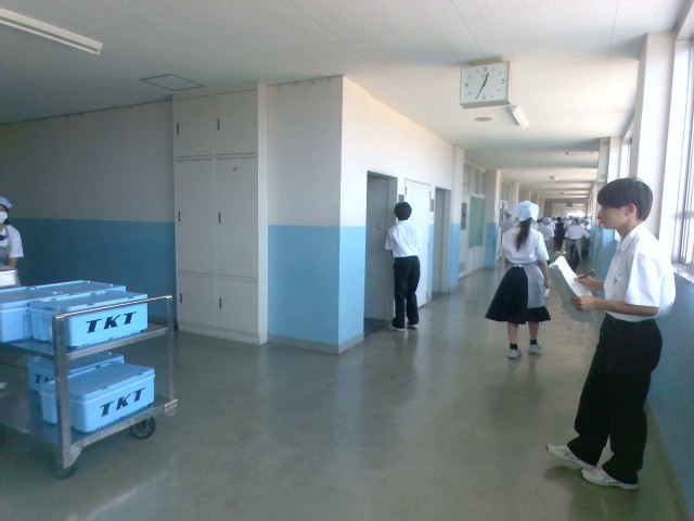 給食準備の時間になるとすぐに当番のチェックを始める給食委員、重い食缶を教室まで運ぶ給食当番、教室で着席して待つ生徒など、それぞれの役割を誠実に果たそうと頑張る姿が見られました。給食の片付けでは、教室のある4階から1階の配膳室まで運ばなければいけないのですが、「ごちそうさまでした!」「ありがとうございました!」とさわやかに挨拶をしながら返却してくれる生徒ばかりです。