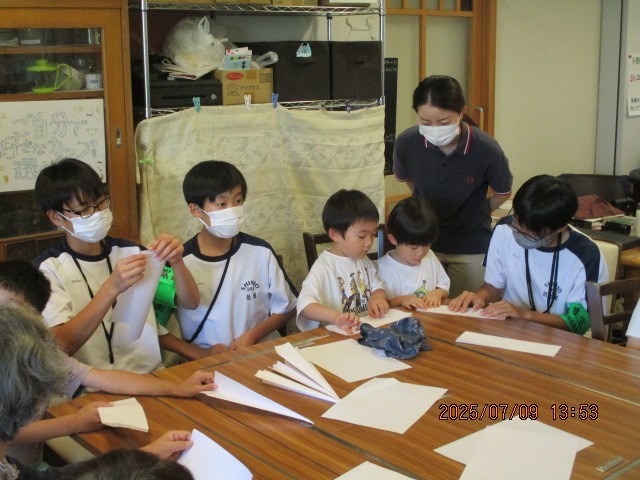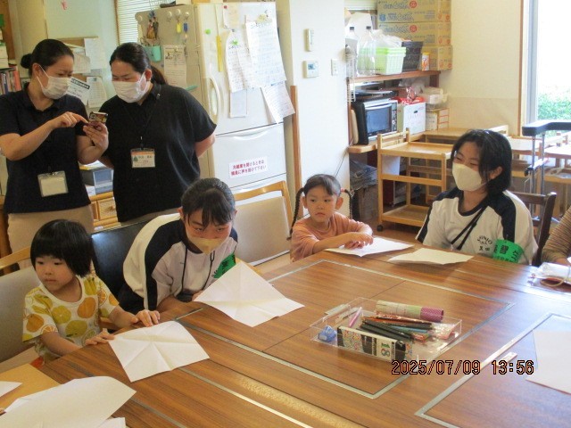 一人の利用者さんのご指導の下、他の利用者さん、園児さんと一緒に折り紙を折っているところです。