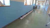 身体測定と聴力検査を実施した保健室前廊下の様子です。測定のために脱いだ内履きが廊...