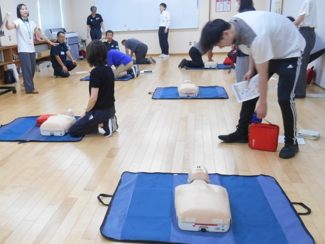 赤十字救急法指導員を講師にAEDを用いた心肺蘇生法、熱中症対策の研修会を行いました。いざというときに対応できるよう、教職員が講習に参加しました。