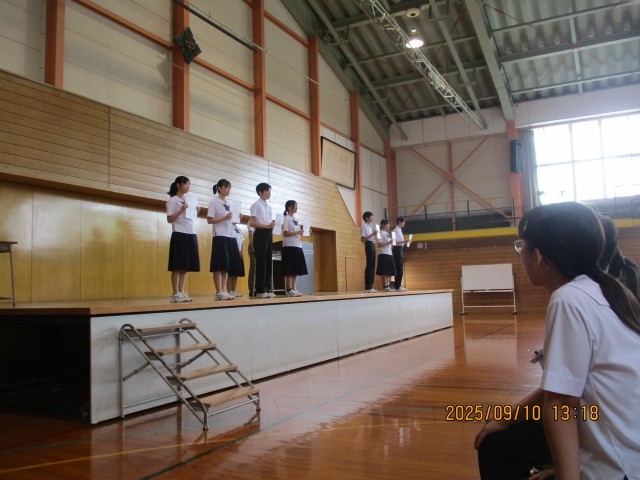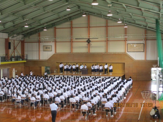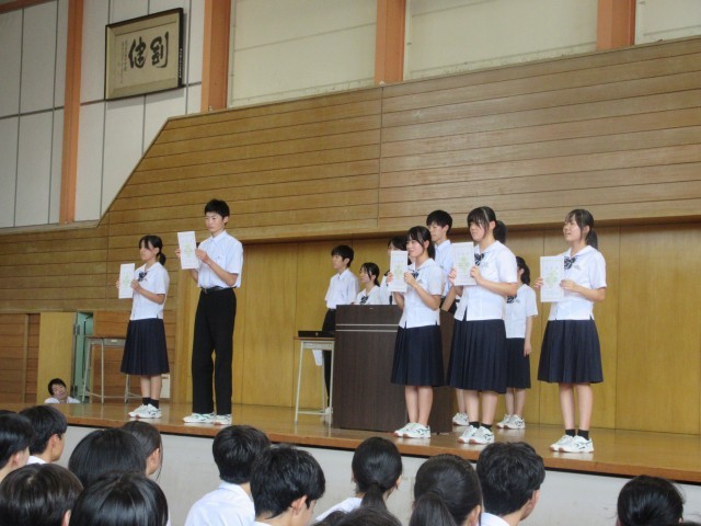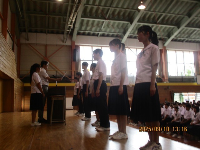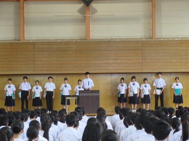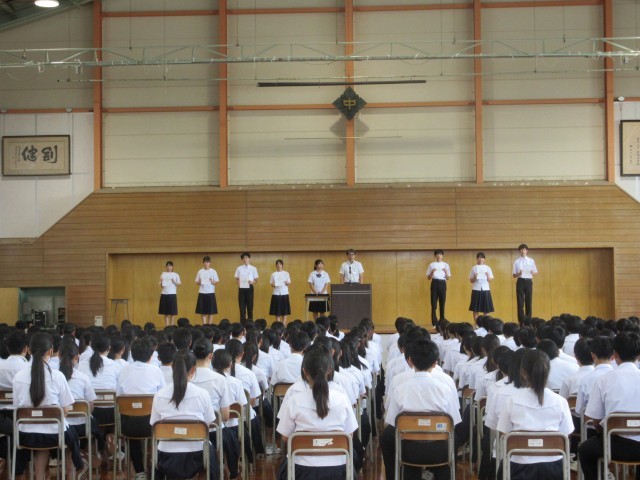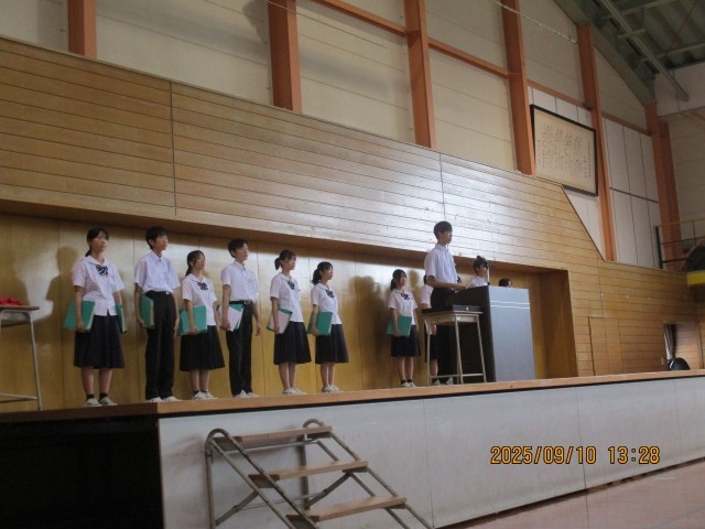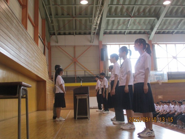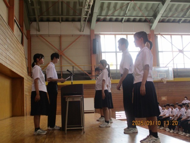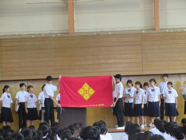 生徒会役員認証・任命式が行われ、前期から後期の役員への引継ぎが行われました。