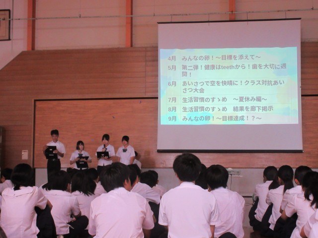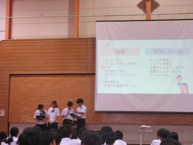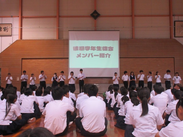 後半では、後期生徒会のメンバー紹介を行い、各クラスの目指したい姿、活動の計画を発表をしました。