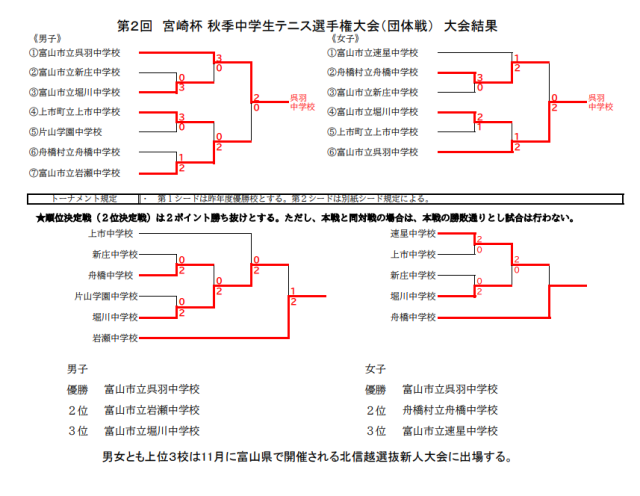 10/11(土)、岩瀬スポーツ公園で宮崎杯中学生テニス大会団体戦(硬式テニス)が行われ、本校生徒が出場しました。