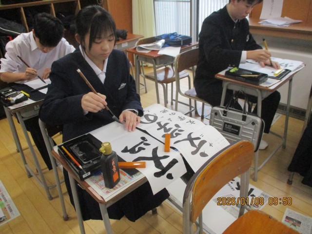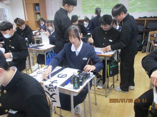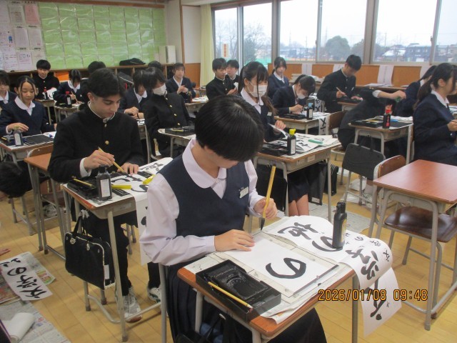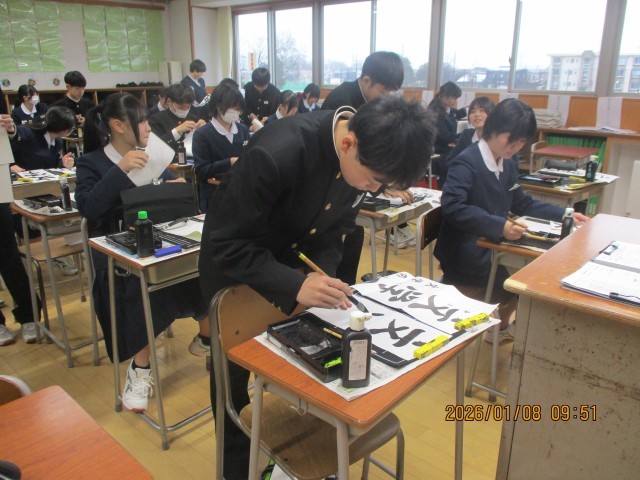今日は2限に書き初め大会を行いました。「冬休みにしっかり練習してきた!」「今年は金賞を狙う!」などの声も飛び交う中、思いを込めながら真剣に取り組んでいました。