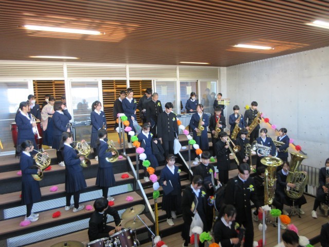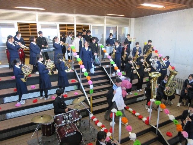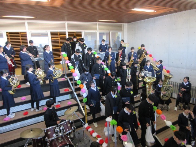 そして、吹奏楽部の演奏に囲まれて、正面玄関の大階段から校舎を出ていきます。