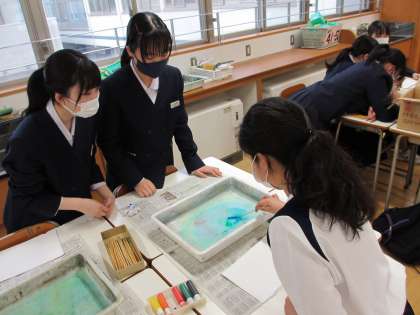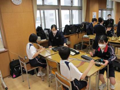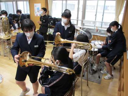 写真左・中:吹奏楽部では、初めて触る楽器に興味津々。