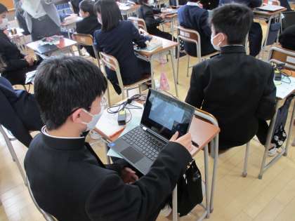 昨年度から導入されている「一人一台デジタル端末」、クロムブックの準備をしています。これから相棒となる端末に、自分の名前のシールを貼りました。