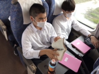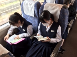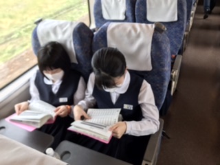特急サンダーバードの車内では、読書、しおりの確認、しりとり等をして過ごしています。健康状態は良好です。