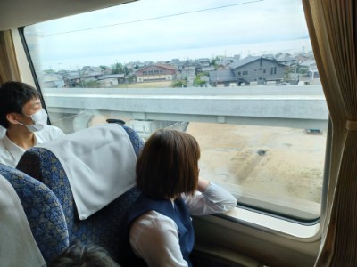 サンダーバードの車窓から琵琶湖を見て、その大きさに歓声があがっていました。