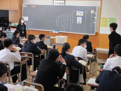 「あいさつをされるとうれしいのはなぜだろう」「あいさつはなぜ大切なのだろう」など、いろいろな側面からあいさつについて考えました。積極的に発言する生徒、発言する生徒のほうに自然に視線を向ける生徒が多くて、落ち着いた時間になりました。