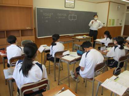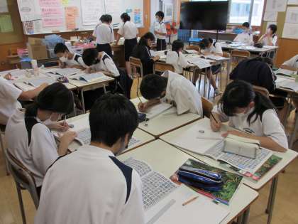 数学の授業は問題演習をしていました。黙々とプリントの問題を解いて、その後の解説を真剣に聞いていました。