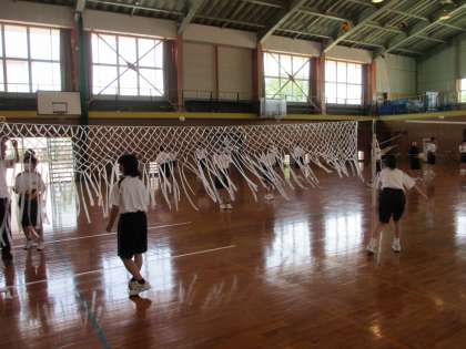 体育の授業ではバレーボールをしていました。ネットを挟んでパスの練習をしていました。広く体育館を使えるようにと、コートとコートの間に先生が、何と!手作りでネットを張っていました。