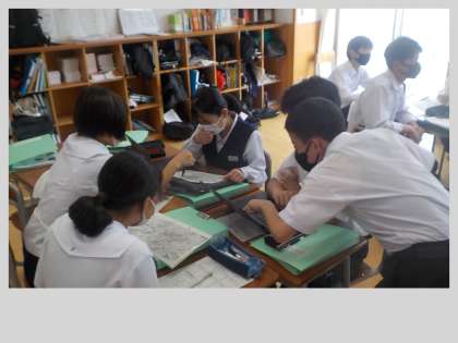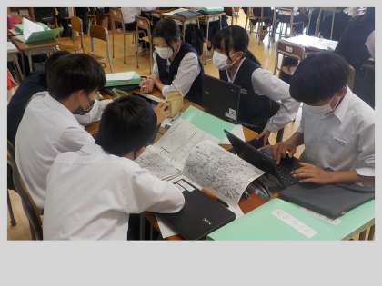 総合の時間では、金沢で行う班別学習でのコース決めを行いました。班長を中心に、時間内に回れるように、検索して、コースを作っていました。この調子で、協力して行いましょう!