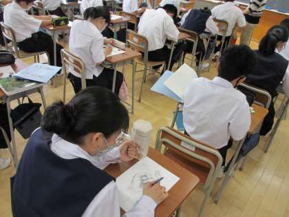 美術は自分の手をデッサンしていました。思い思いに指のかたちを決めて、じっくりと眺めながら紙に線を引いています。
