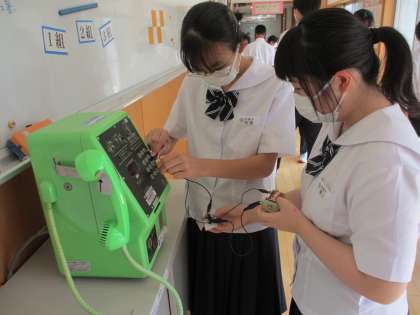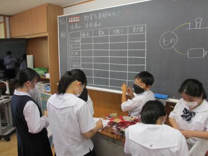 理科の授業では、「金属か、非金属かを見極める」という学習テーマに取り組みました。磁石と豆電球の装置を持っていろいろな物に試してみて、特徴を表にまとめていました。
