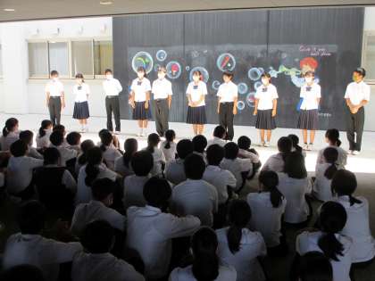 6時間目のはじめに、体育大会の実行委員と団リーダーを紹介しました。クラスを超えていつもと違うメンバーと一緒に活動する体育大会。みんなで力を合わせていい思い出になる体育大会にしようと、それぞれ一言ずつ思いを呼びかけました。