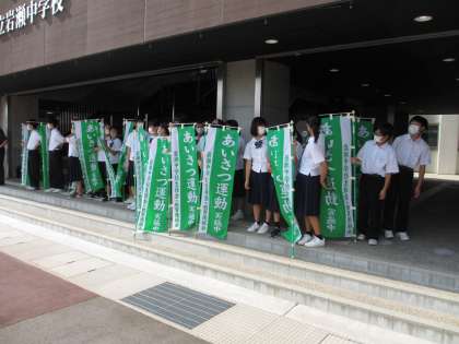 みんなでのぼり旗をもち、登校してくる生徒たちに明るくさわやかなあいさつをしていました。