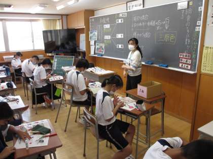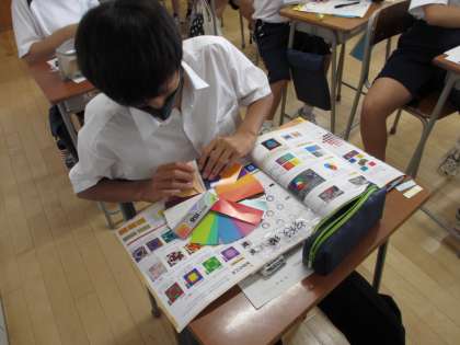 美術の授業では、新しく配られた「配色カード」を使って、色の勉強をしていました。本格的な道具を手にして、生徒たちはわくわくしていました。