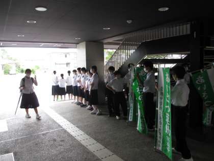 今日のあいさつ運動は、1年2組の番でした。登校してくる生徒に元気よくあいさつしていました。